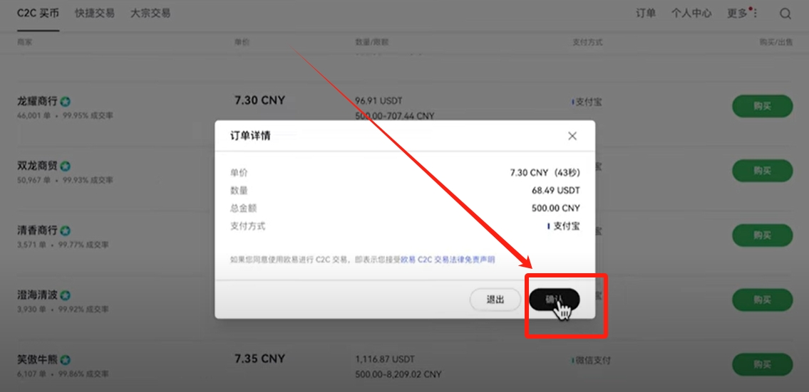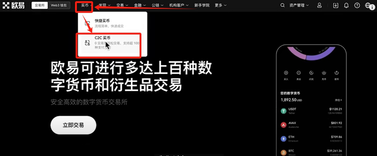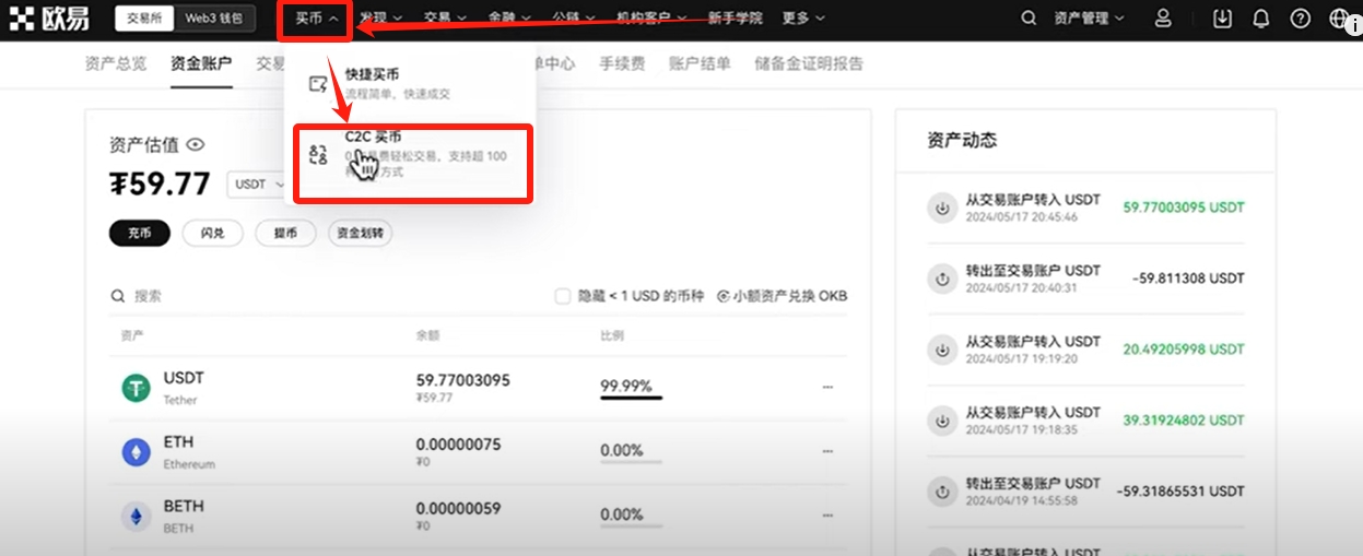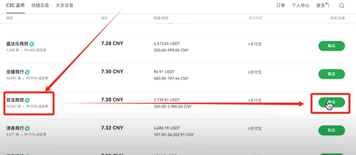 划转完成之后,点击上方的【买币】,还是选择【C2C买币】。