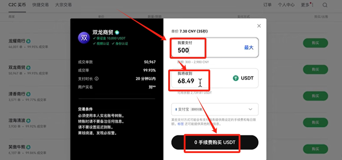 再次输入一下你要购买的金额,他下方自动会为你算出来,我们支付500人民币将收到68.49颗USDT。点击【0手续费购买USDT】。