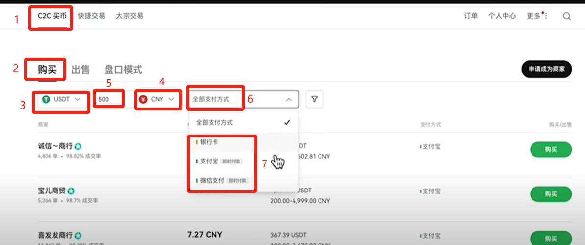 输入要购买的金额,比如说500块。选择一下支付方式,有三种支付方式,银行卡、支付宝还有微信支付。你习惯用哪种方式支付,就使用哪种交易方式支付。下方就会为你筛选出符合条件的商家,我们尽量要找成交量和成交率高的商家来进行购买。