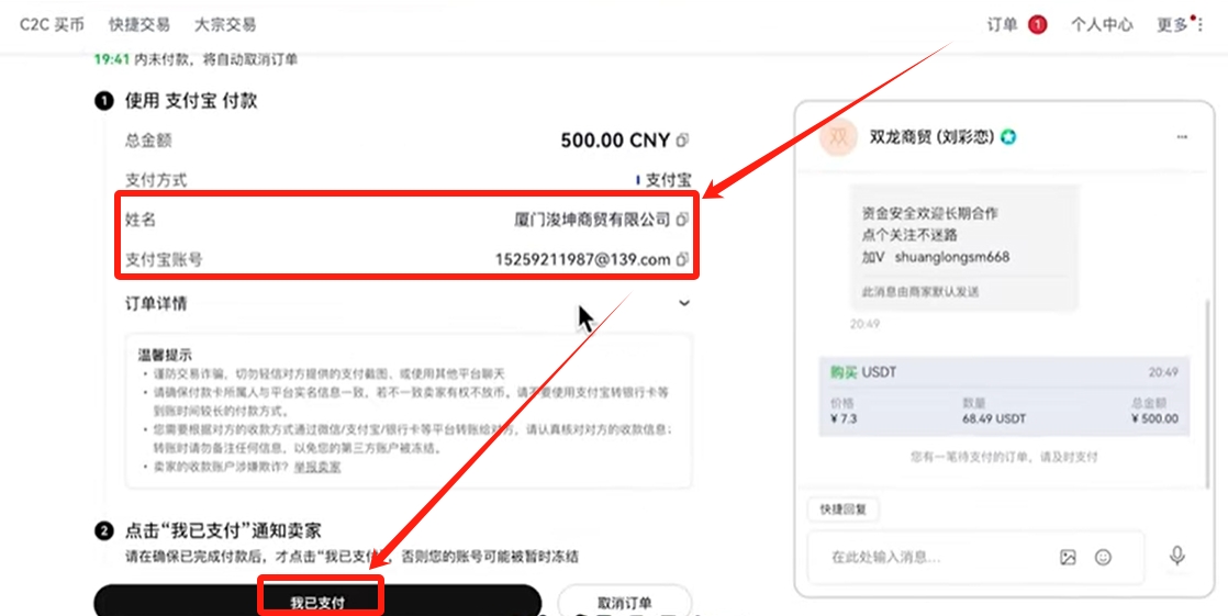 根据商家提供的支付方式给他转钱,转完钱之后点击【我已支付】,等待卖家核实收到钱之后,就会放币给我们了。