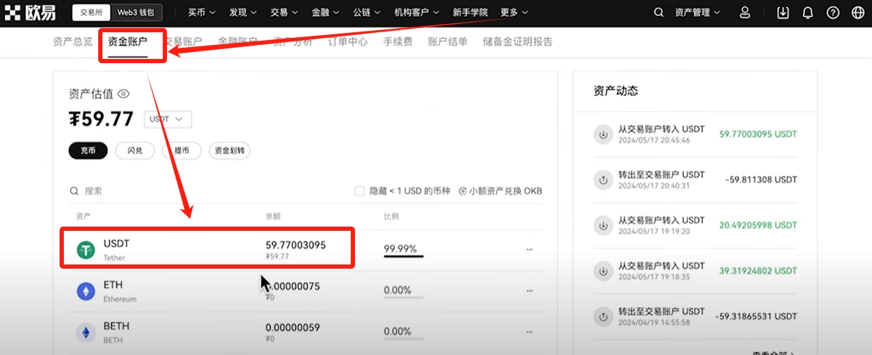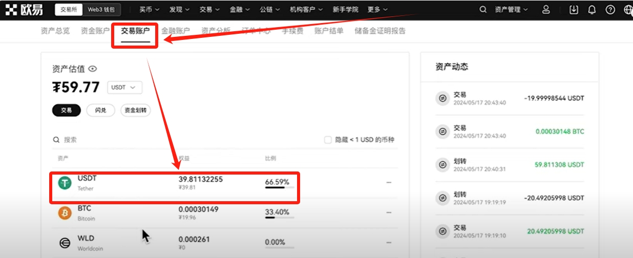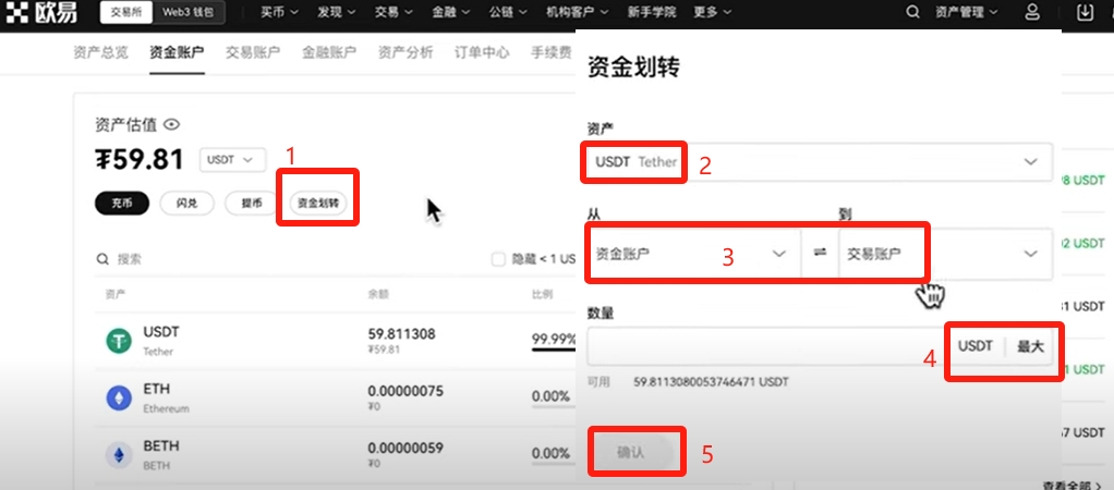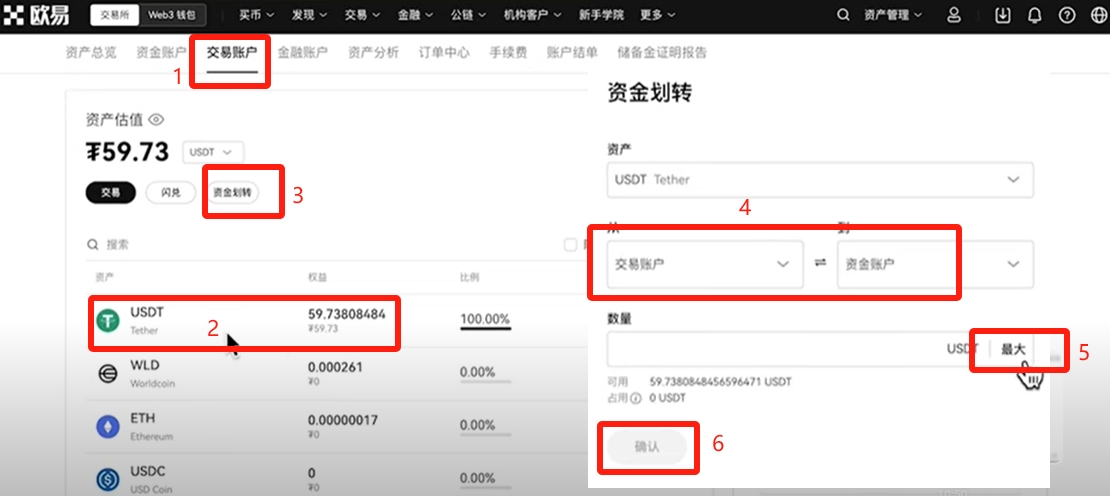 找到【交易账户】,可以看到我们的比特币已经换成了USDT了。再次点击【资金划转】,把USDT从交易账户划转到资金账户。因为我们想要提现,提现的第一步就要把USDT放到它变现功能支持的账户里面。,也就是资金账户。点击【最大】,再点击【确认】。我们的资产就划转到资金账户了。因为只有资金账户才有变现和买入的功能。