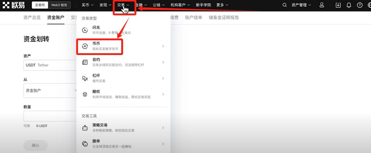 我们把资金划转到交易账户之后,就可以去进行交易了。点击上方的【交易】按钮,选择【币币】。