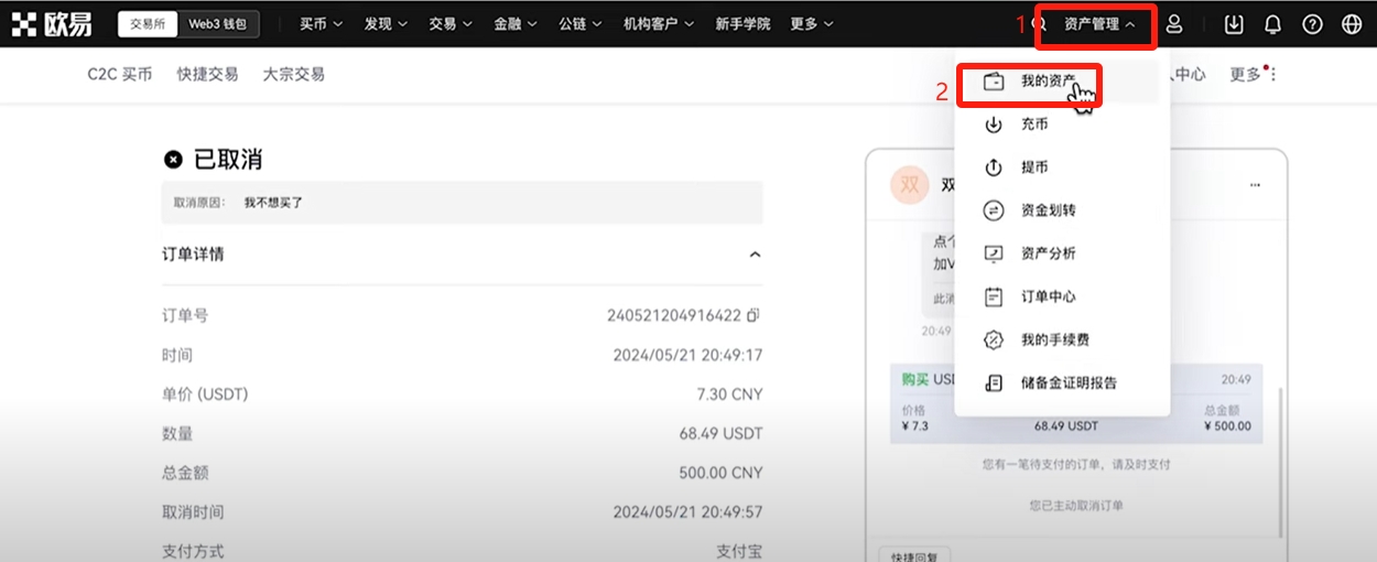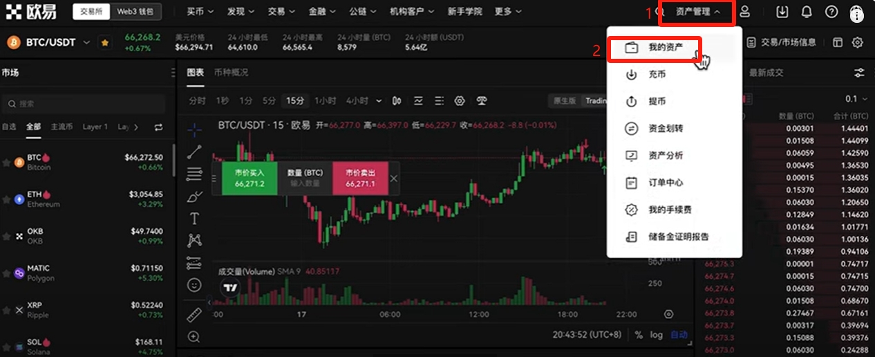 现在我们的比特币就购买成功率。我们还是回到上方的【资产管理】,找到【我的资产】。