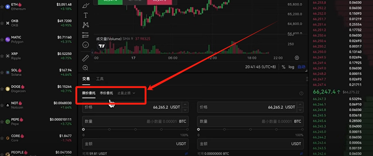 在这里就可以去买其他的虚拟货币了。在左上方这里你可以搜索你要交易的币种。你想要购买哪个币都可以在这里搜索,然后使用USDT来进行兑换。比如说你想购买比特币就可以搜索“BTC”,选择“BTC/USDT”的交易对就是我们用USDT去兑换比特币,前面是我们要购买的币种,后面是我们所持有的币种,也就是USDT。同样的你可以用USDT去兑换其他的任意虚拟货币。