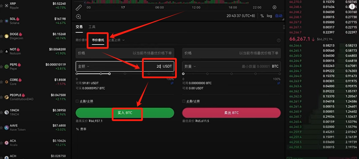 如果说你现在就想买,我们可以选择市价委托。市价委托就是他会以当前市场最优惠的价格成交。我们直接输入要购买的金额就可以购买成功。输入20,点击【买入BTC】。