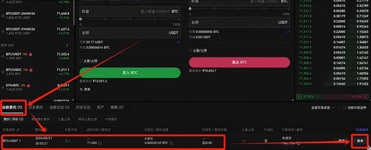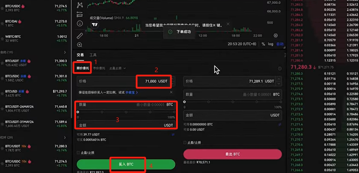 限价委托的意思就是,我们来报一个价,必须得跟这个价格差不多的时候才能够成交。比如现在的价格是71310,你想以71000的价格来进行购买,你就可以在这里输入你想要购买的价格,然后输入你要购买的数量或者是金额,点击【买入BTC】。