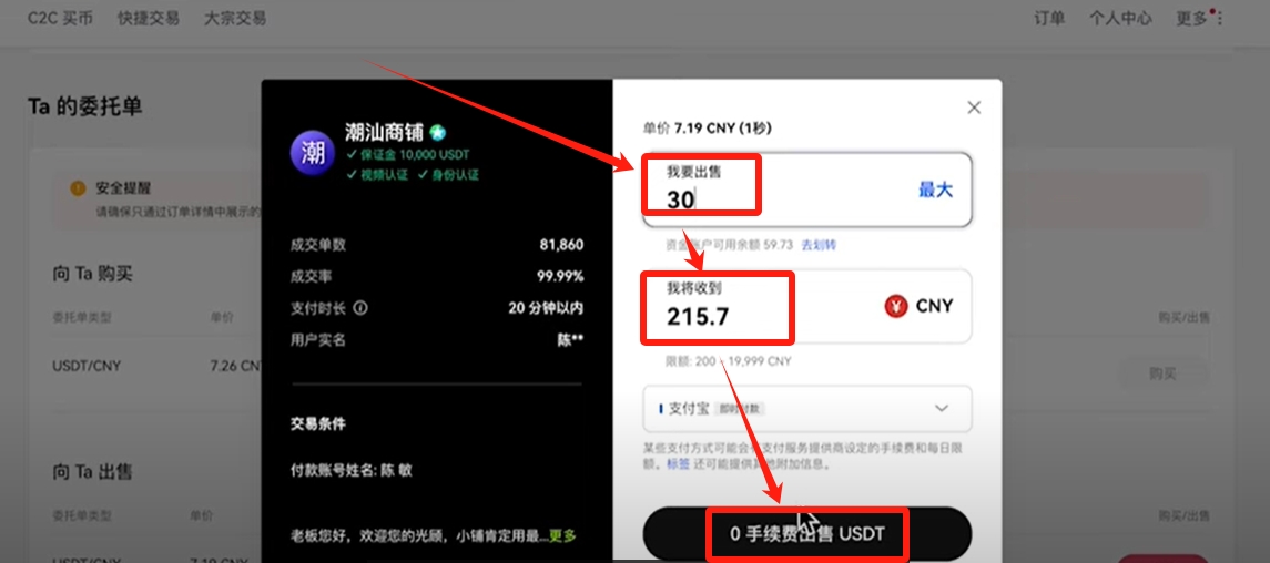 再次输入将收到215.7人民币。然后点击【0手续费出售USDT】。