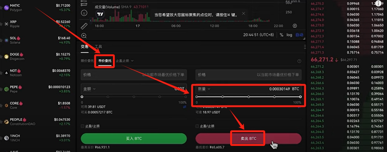 往下滑,我们还是选择【市价委托】,这时候我们要把所持有的比特币卖出,卖成USDT。数量拉满,就是全部卖出。点击【卖出BTC】。下单成功之后,我们的手里就没有比特币了。我们把比特币卖成了USDT。