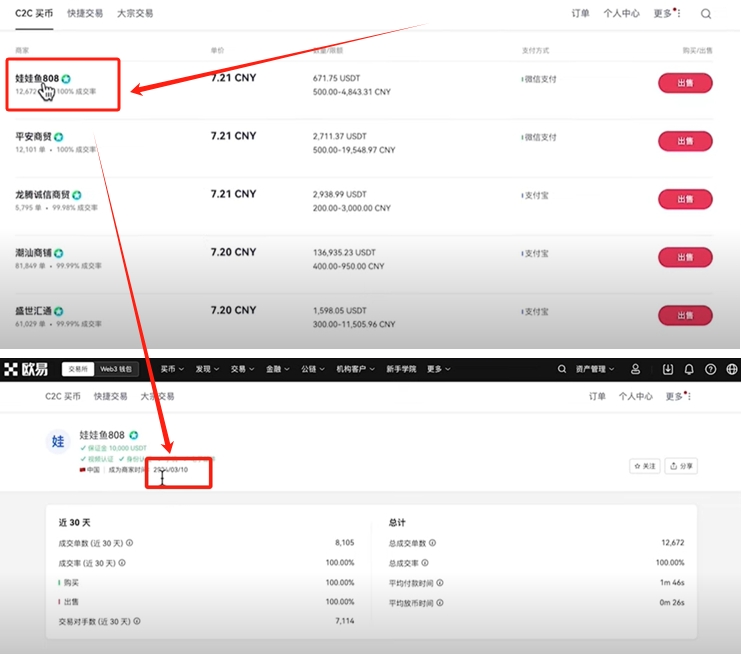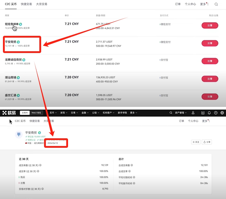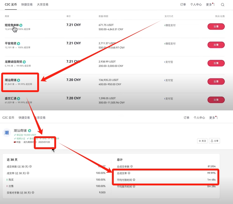 接下来我们就要筛选卖币的商家了。卖币的时候,首先要排除USDT出价最高的。因为出价最高的人,给你转黑钱的概率最大。我们找商家的时候,最好要找那些注册时间超过一年的商家。成交率在99%以上的商家,平均付款时间越短越好。那些平均付款时间超过5分钟的商家很容易出现问题。比如我们点击第一家来看一下。他的注册时间太短了,才两个月。