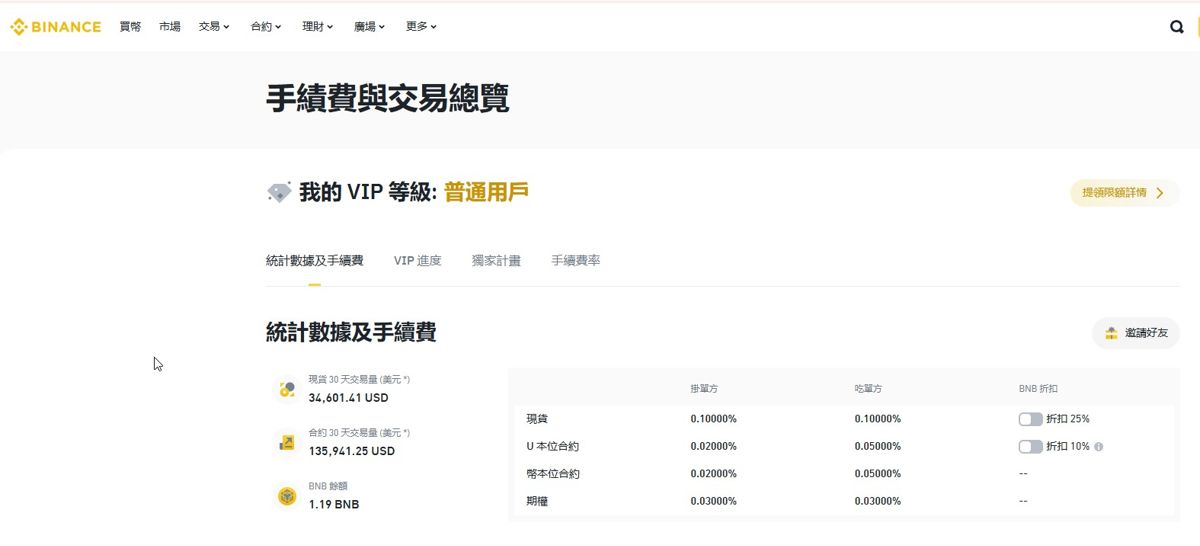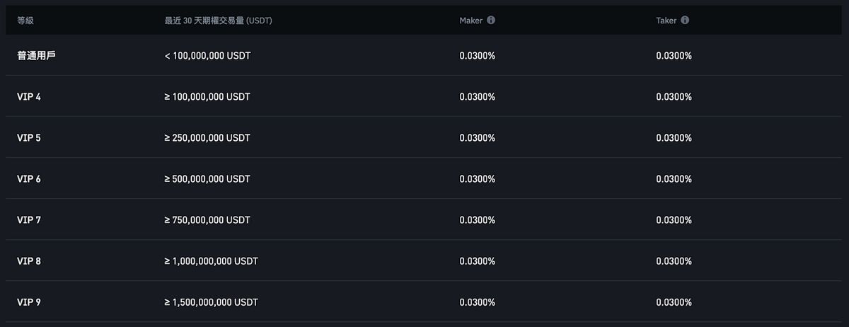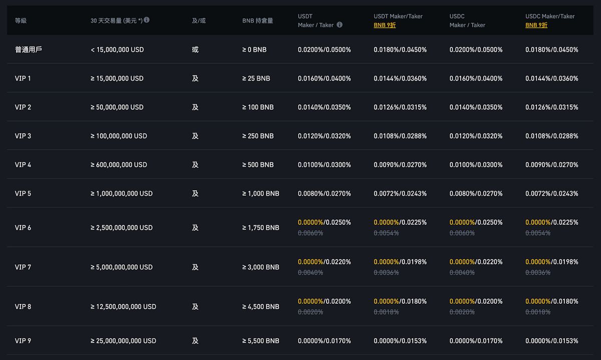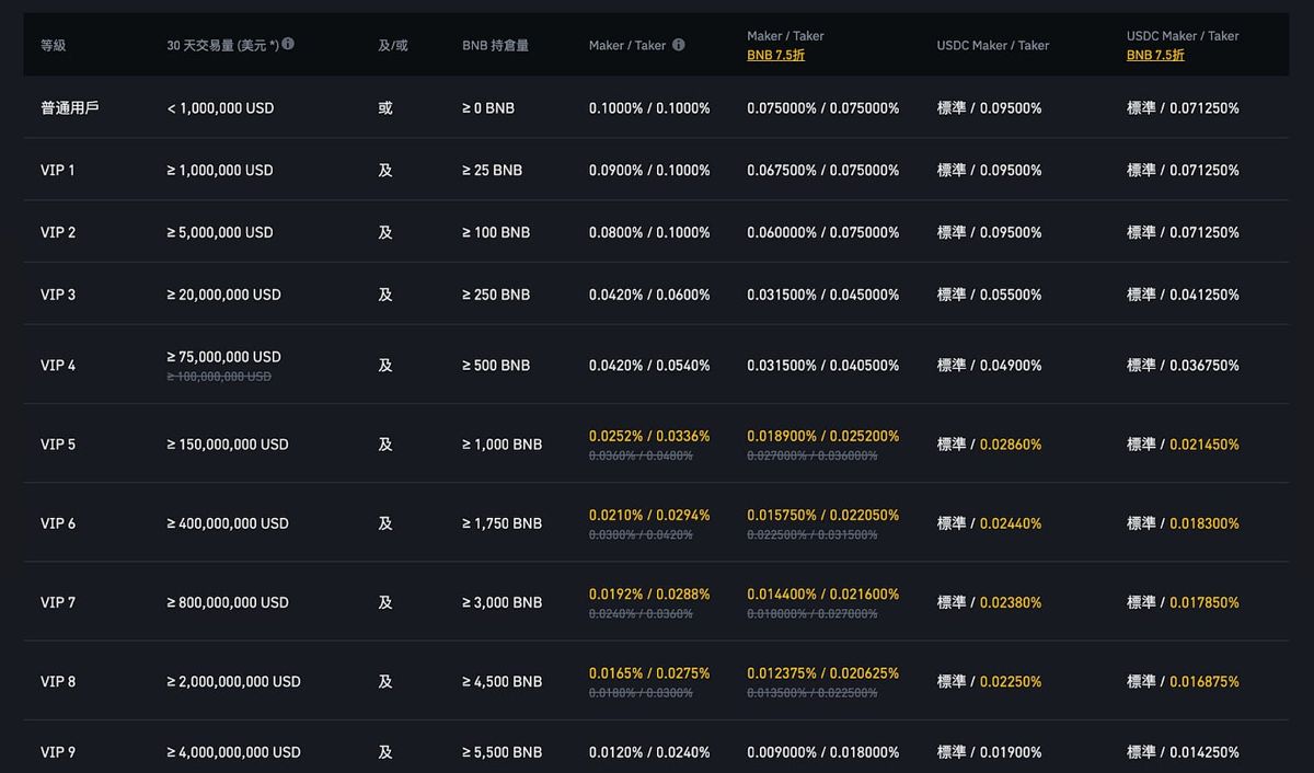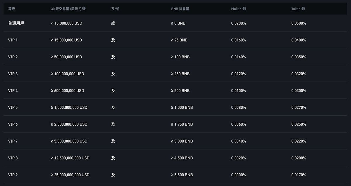 如果三十天的交易量达到2000 万美元,且持有250 颗以上的BNB (价值约17.5 万美元),那就享有0.04%/0.06% 的费率这样。