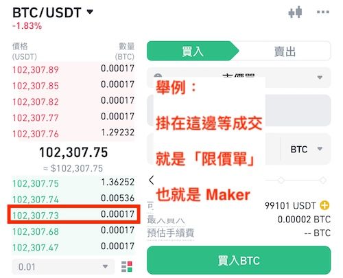 - 例如BTC 现在价格100,000,你挂一个99,985 的买单,那你就是挂单方,挂的是「限价单」。