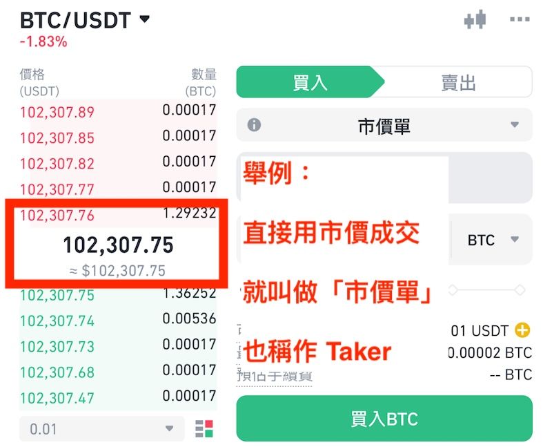 而所谓的吃单方(Taker),是指你立刻根据现有行情成交,别人挂什么价格你直接买,这就是吃单方,挂的是「市价单」。