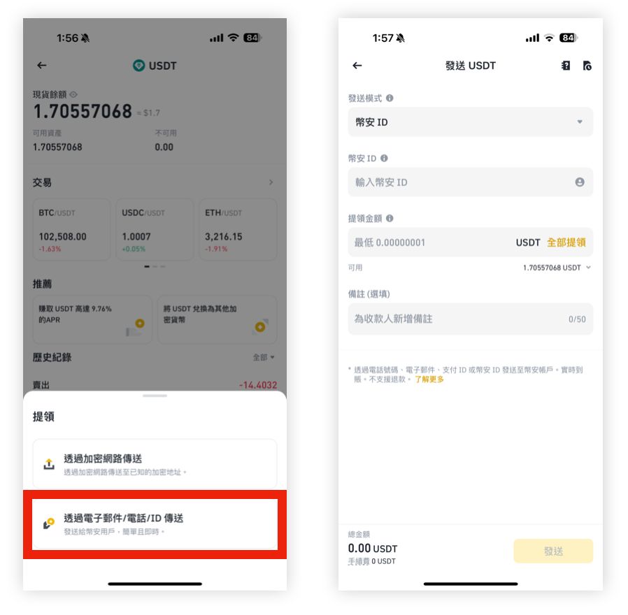 在钱包的「提领」钮中,选择「透过电子邮件/电话/ID 传送」,输入对方的UID 即可直接转过去,过程不需要手续费。