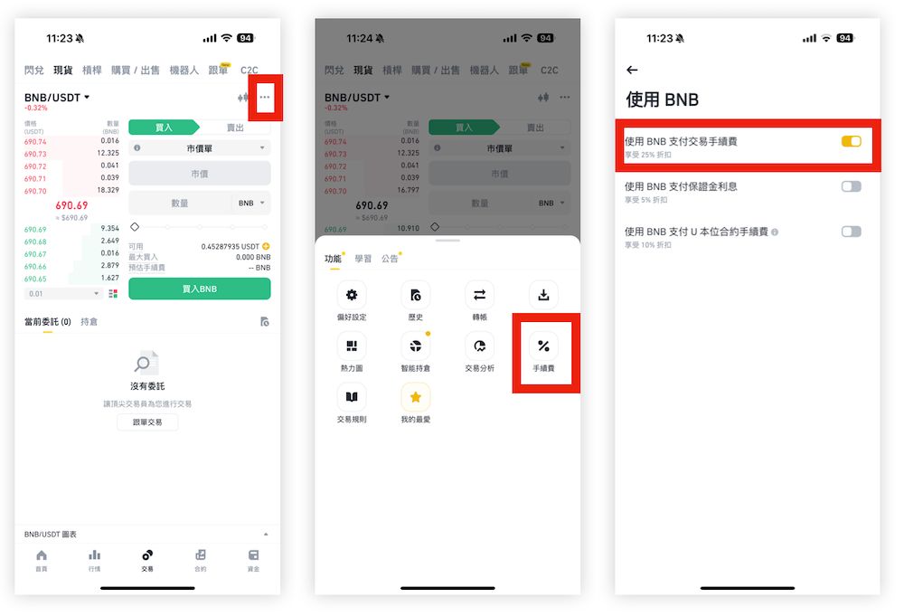 如果你手中持有BNB (毕安币),并在交易介面中开启「手续费」>「使用BNB 支付交易手续费」,那么就可以再获得25% 手续费减免。